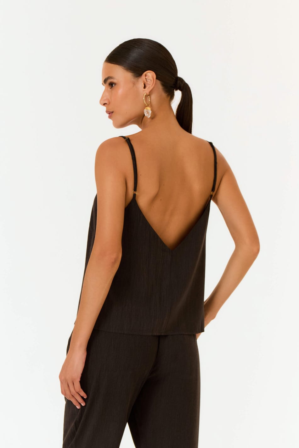 Regata com decote V frontal e profundo nas costas, que oferece frescor e movimento ao vestir. Confeccionada em tecido plano liso com composição de lyocel e viscose, proporciona conforto e caimento fluido. Versátil e atemporal, é perfeita para composições femininas que unem praticidade e sofisticação sem esforço.