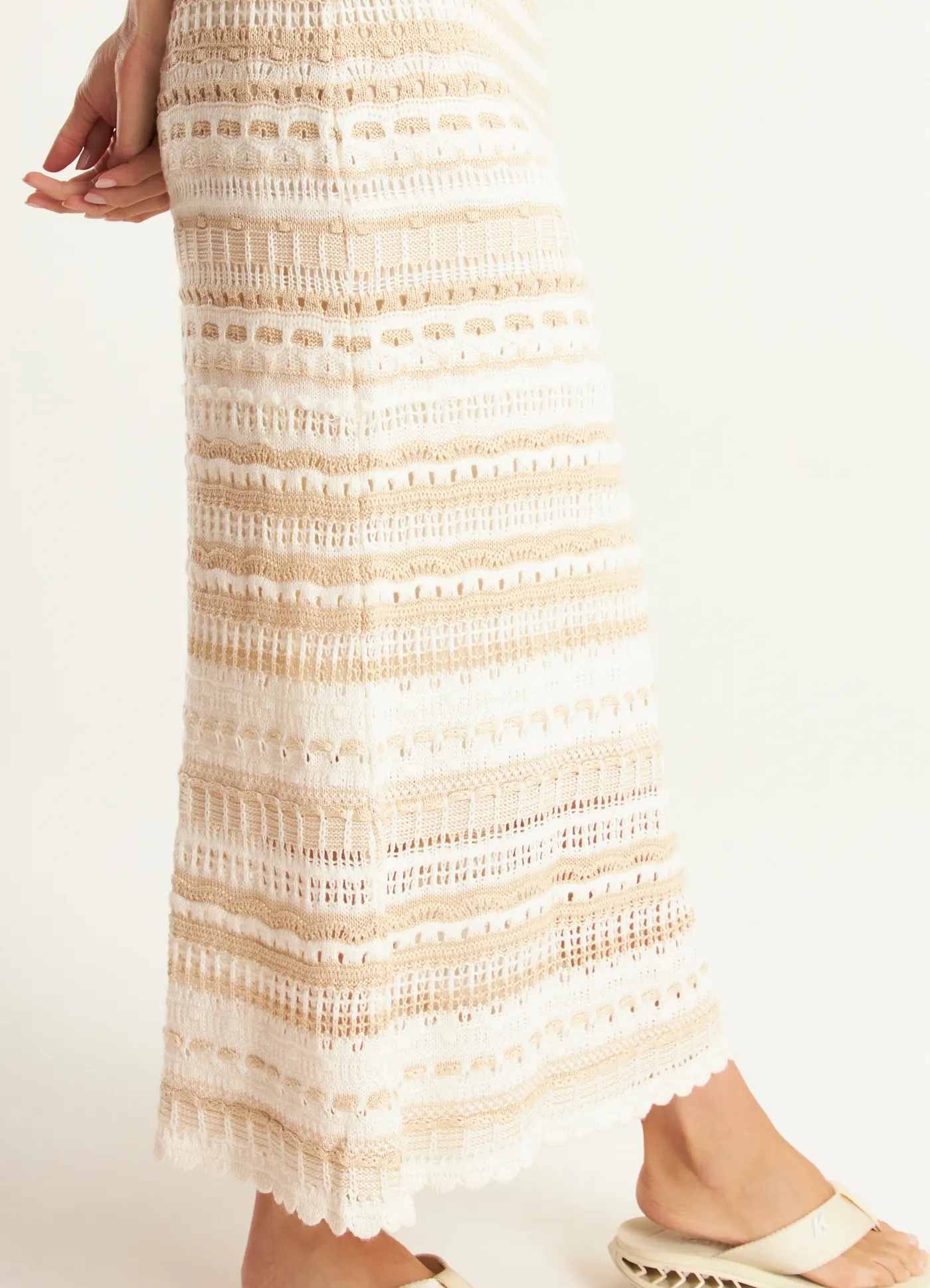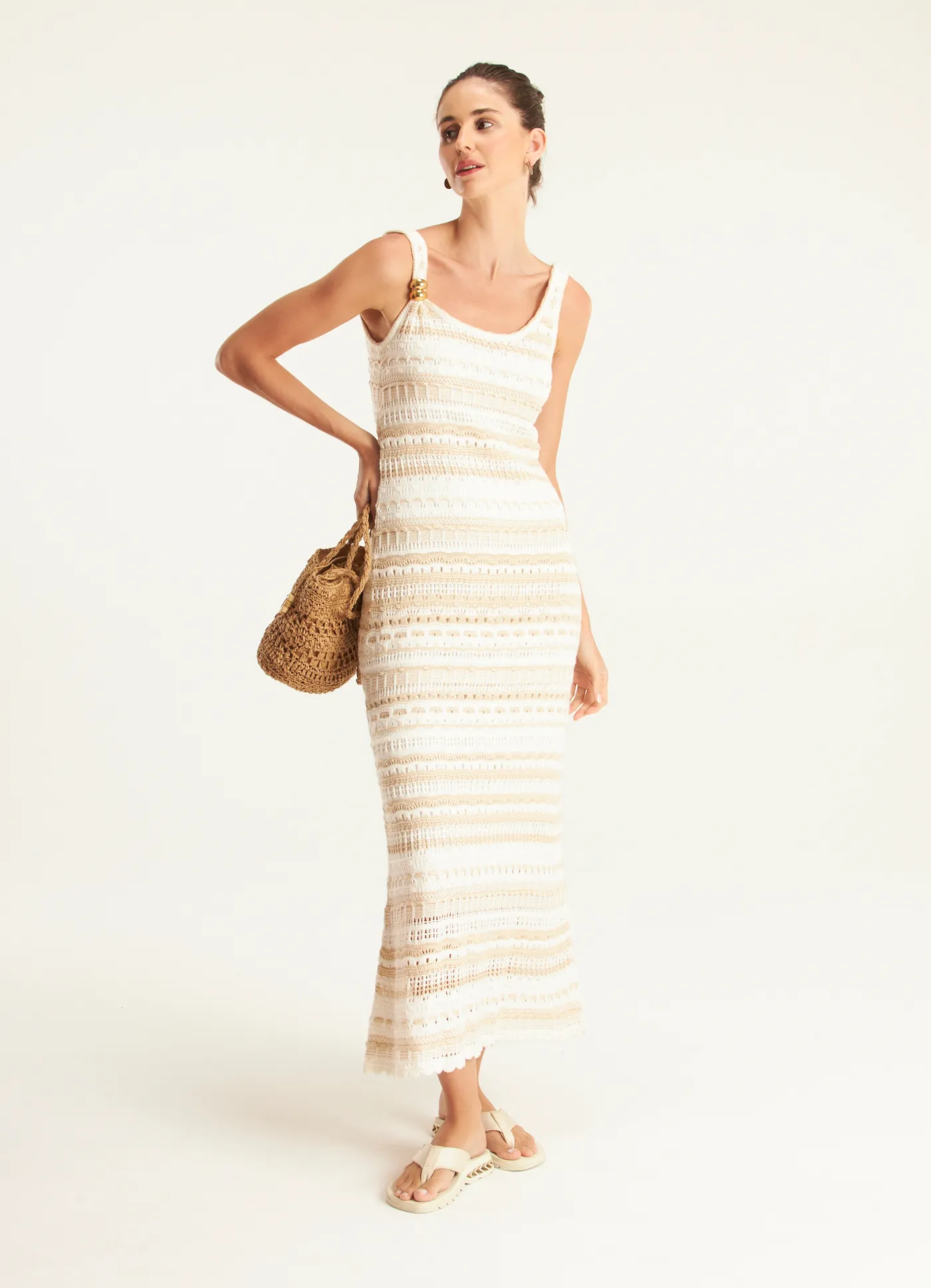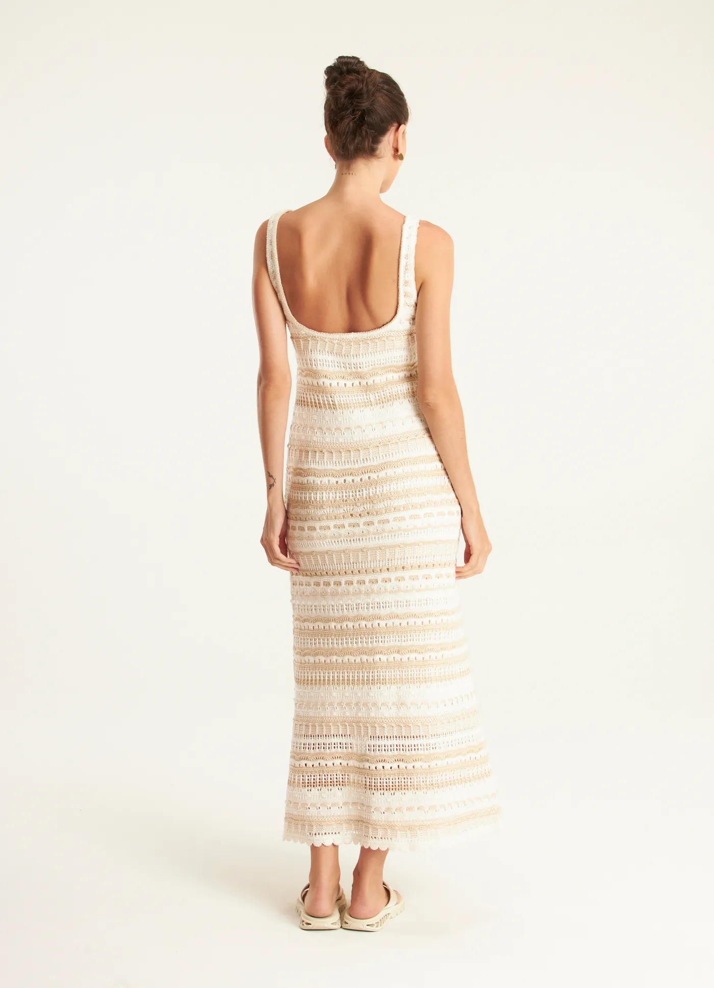 Com modelagem reta e caimento leve, o vestido midi em tricot conquista pelo mix de texturas em tons naturais que criam um visual sofisticado. A gola levemente arredondada e as alças largas trazem conforto e sustentação, enquanto o decote profundo nas costas adiciona um toque de sensualidade. Ideal para looks com mood artesanal.